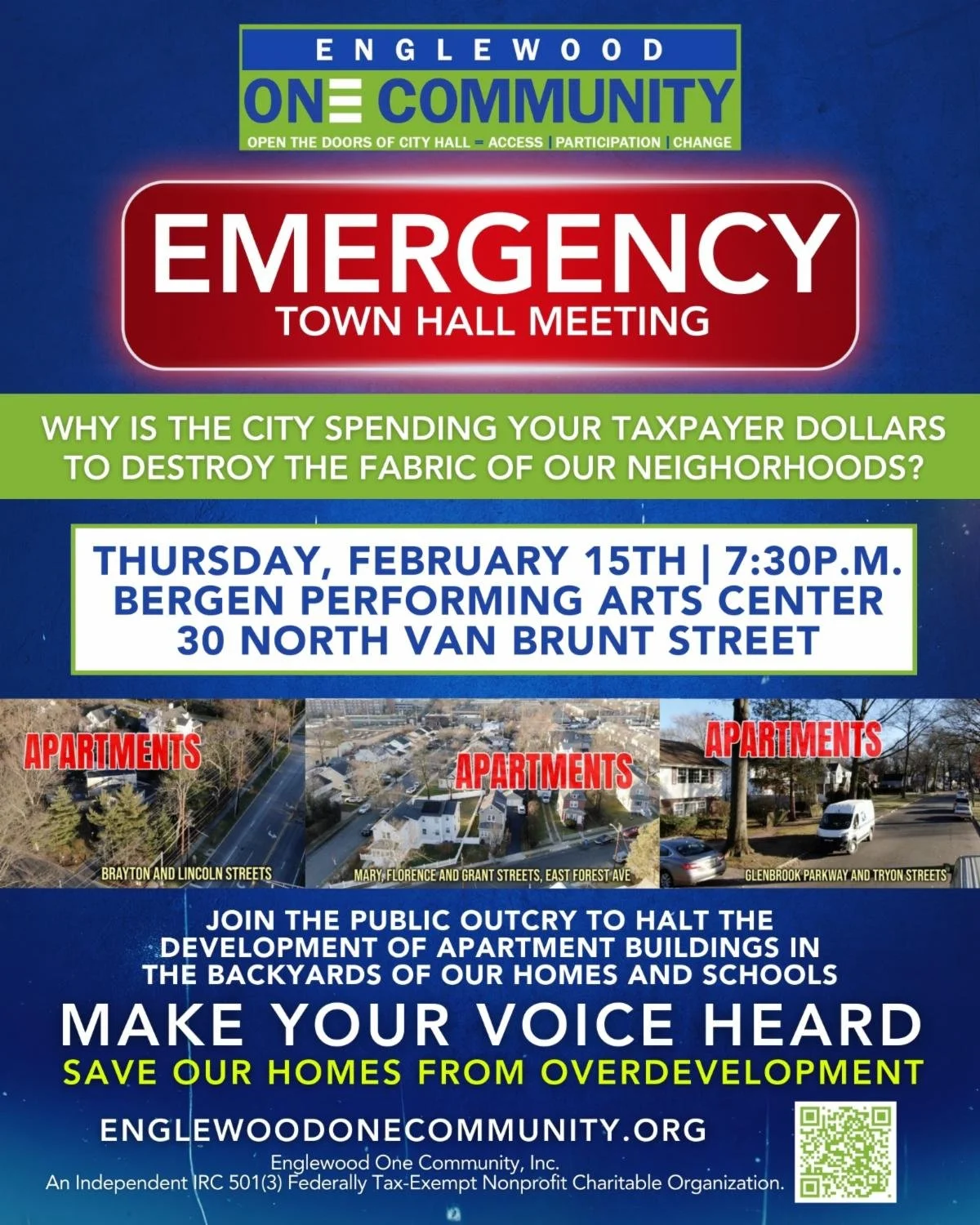 Join us on Thursday, February 15th, at 7:30 p.m. for an Emergency Town Hall Meeting at the Bergen Performing Arts Center to learn about the city new law to develop up to 4,000 apartments and how to halt it to save the character of community and protect from the deterioration values of our homes.